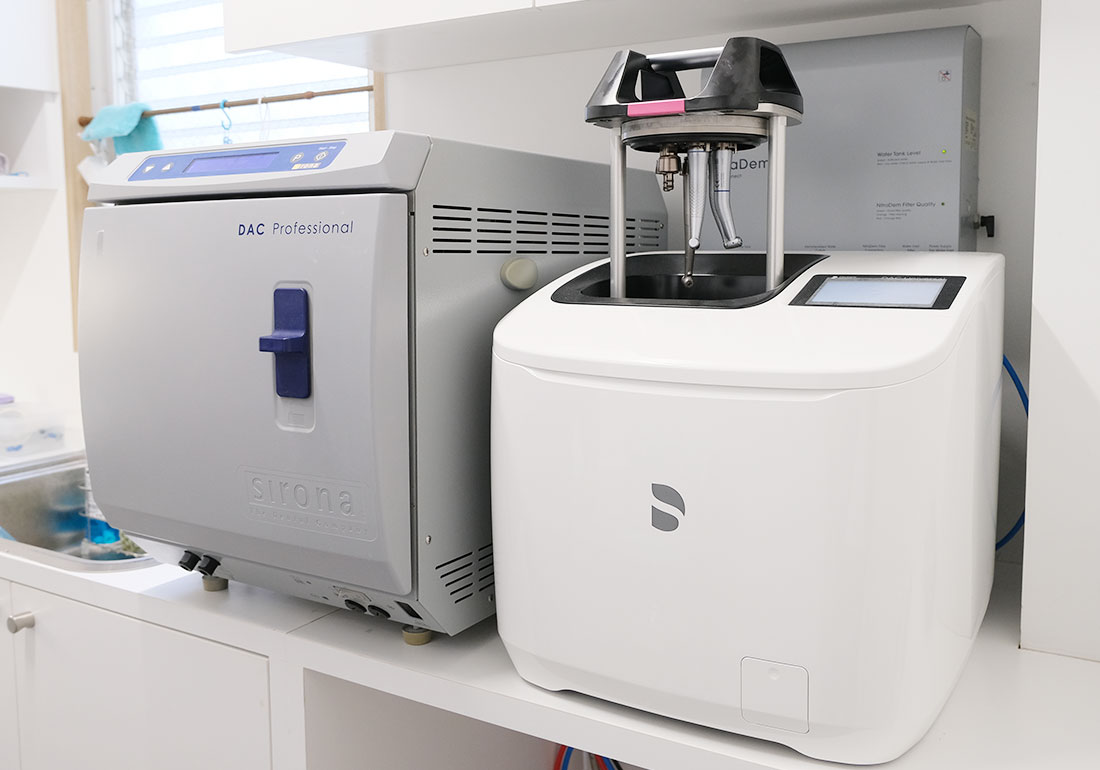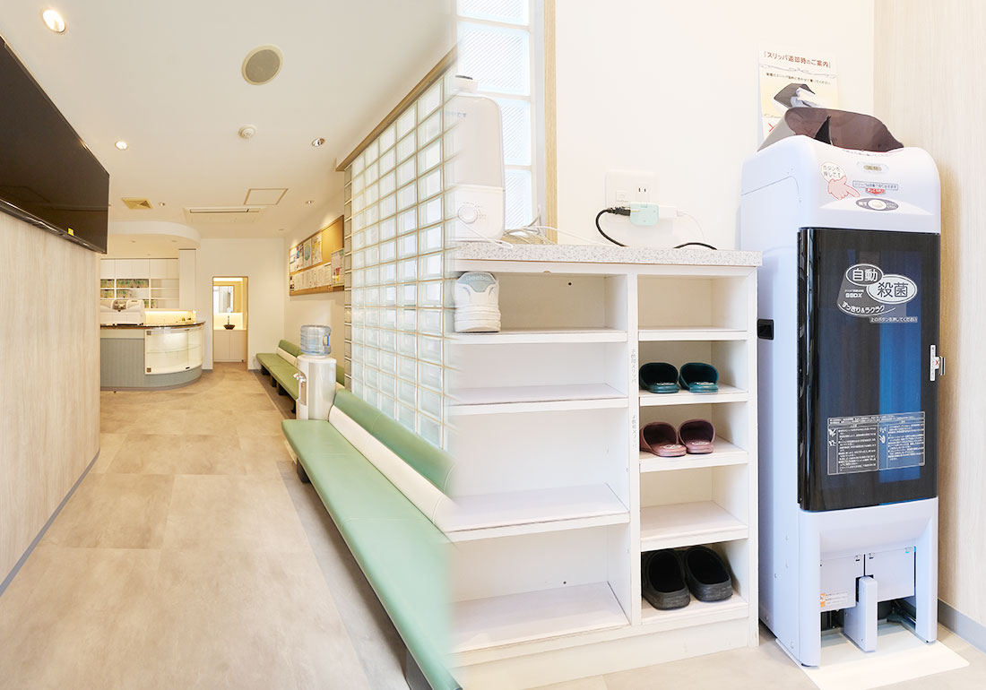 治療に使う器具は高圧蒸気滅菌器でしっかり滅菌し、滅菌できない器具には使い捨て製品を採用しています。また、清潔な診療環境を維持できるよう、空気清浄機やスリッパ消毒器も導入しました。
